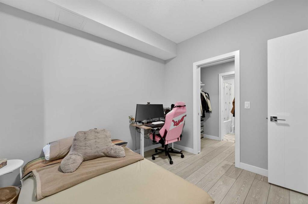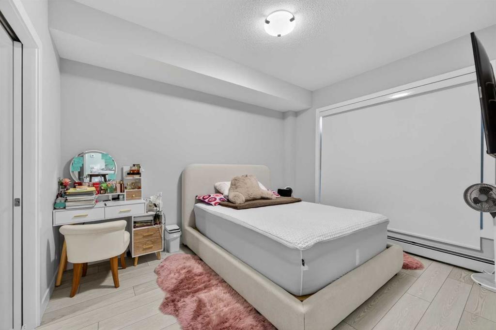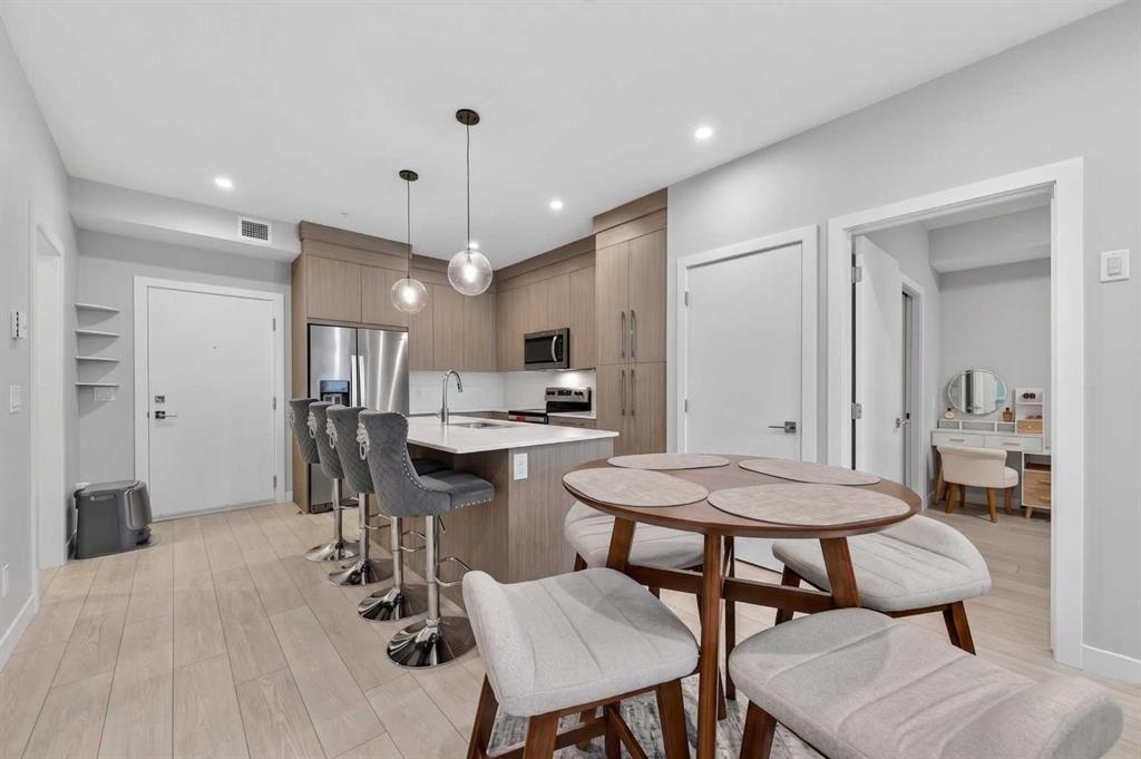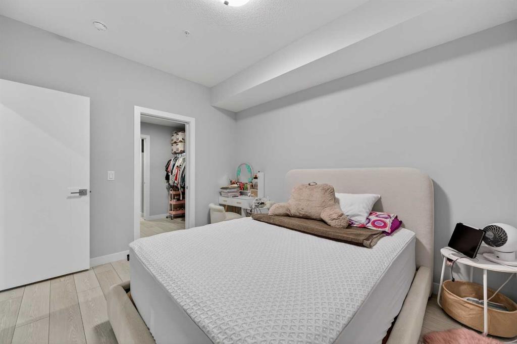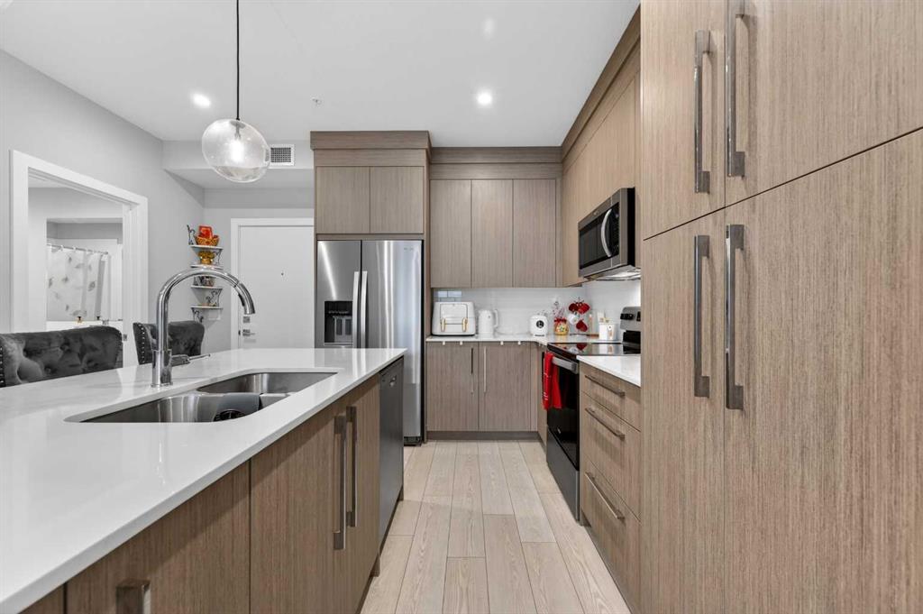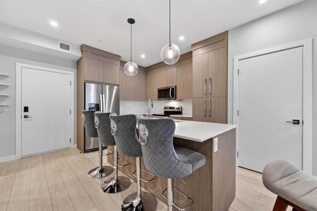Welcome to this beautiful main-floor West-facing unit, offering over 800sqft of thoughtfully designed living space, complete with underground titled parking. This stunning 2 bed, 2 bath condo features wide plank flooring throughout with open concept living. A stylish chef-inspired kitchen featuring stainless steel appliances, white subway tile backsplash, bright quartz countertops, a pantry, and a kitchen island. A spacious primary bedroom comfortably fits a king-sized bed and includes a walk-through closet...