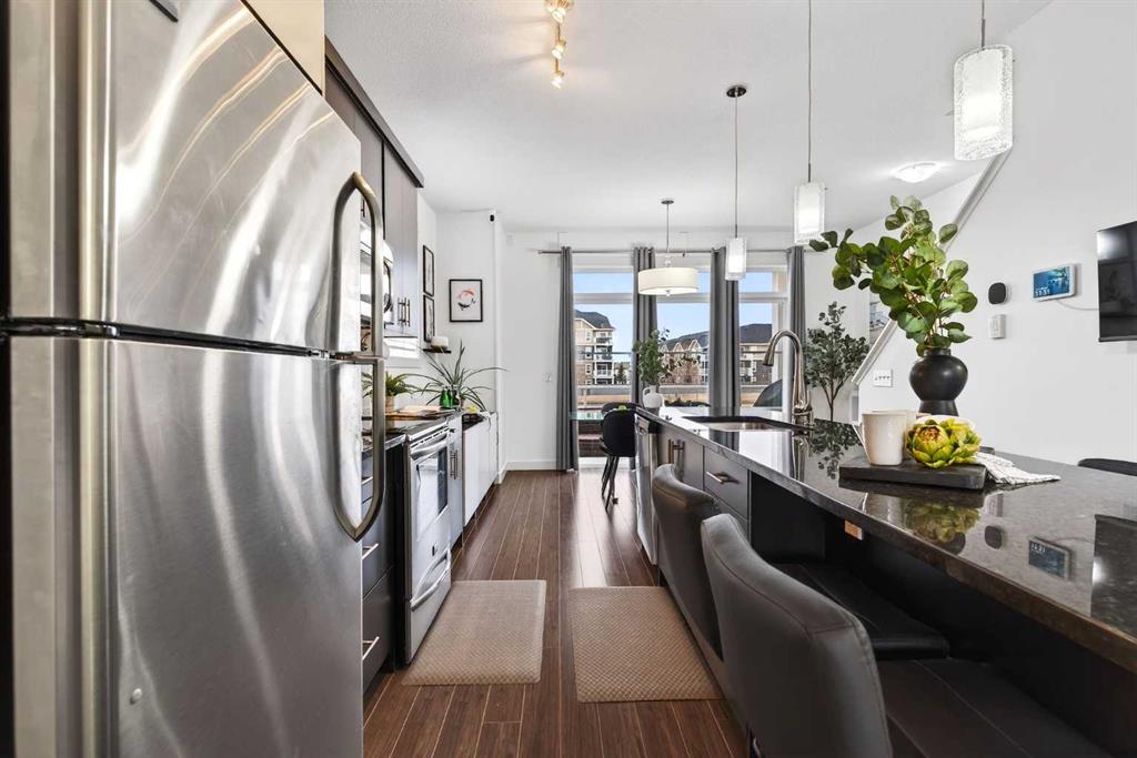 Offering 1,380 sq. ft., this bright END-UNIT townhouse in Redstone features 2 bedrooms, 2.5 bathrooms, a main-level office/den, and an extra-large single attached garage. Enjoy bright sunshine throughout, plus unobstructed mountain views from the second-floor balcony off the dining room and through the large windows in the primary bedroom. Added privacy bonus: no neighbours directly facing your front door. The ground level welcomes you with a spacious front entry and a versatile office/den or recreation sp...