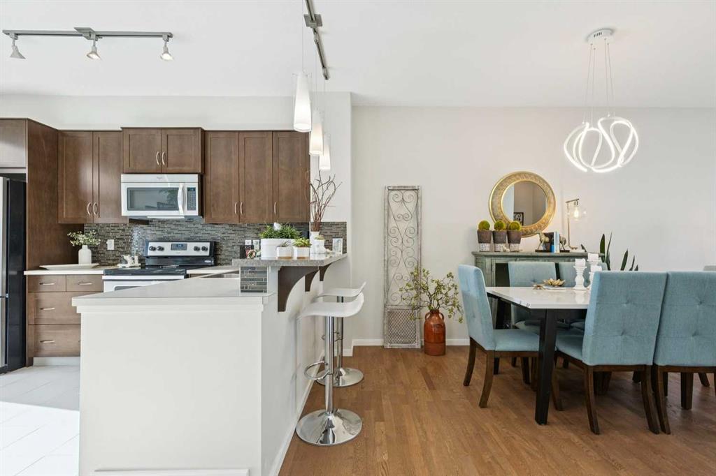 Natural light pours through this beautifully maintained townhome, where the main living level is bright, open, and exceptionally well appointed. The living room is anchored by a gas fireplace with built-ins, creating a warm and polished focal point. From there, the layout flows naturally into the dining area and kitchen, where richly stained cabinetry, stainless steel appliances, and a breakfast bar with raised seating offer both style and functionality. Just off the kitchen, the balcony overlooks the court...