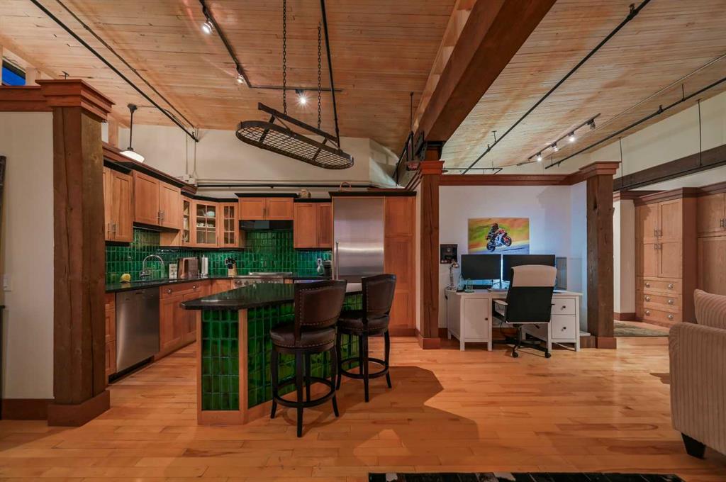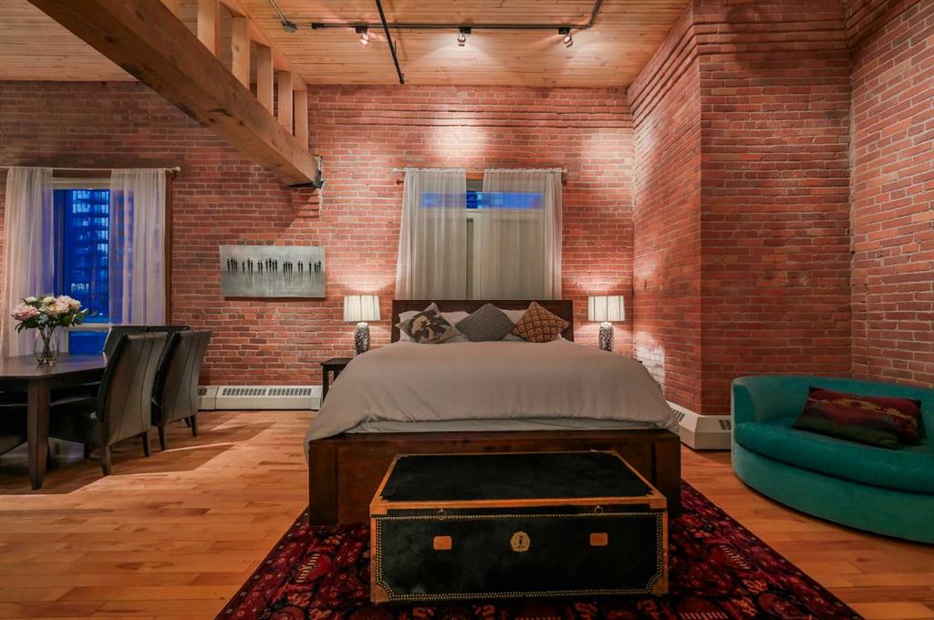 Stunning Penthouse Loft at The Historic Hudson. Nothing will compare...Especially if you're a couple or single working from home or downtown. Originally built in 1909 by the Hudson’s Bay Company, The Hudson is Calgary’s oldest warehouse converted into mixed-use residential/commercial live-in lofts. This east-facing penthouse loft blends rich history with modern luxury—featuring 13’ ceilings, massive wood beams, exposed brick walls, and two skylights. The chef’s kitchen includes recycled oak cabinetry, grani...